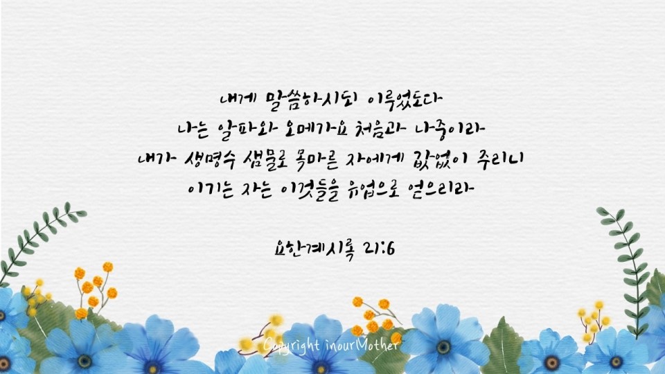 내가 주는 물을 먹는 자는 영원히 목마르지 아니하리니 나의 주는 물을 그 속에서 영생하도록 솟아나는 샘물이 되리라